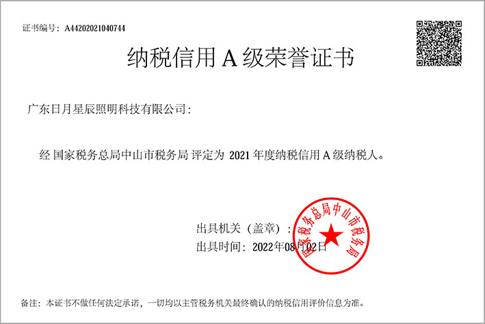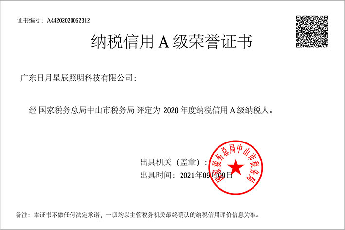 2021年度纳税信用A级荣誉证书