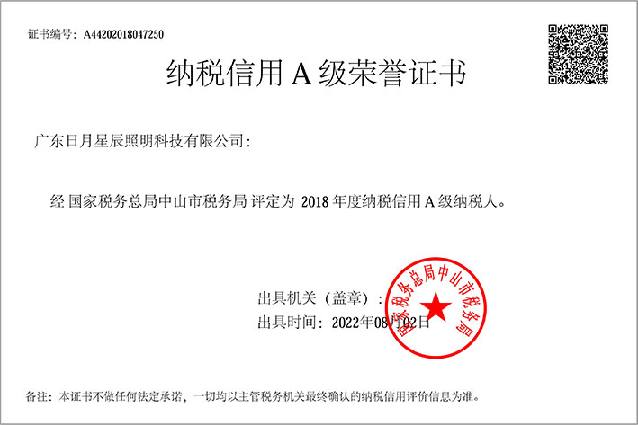 2018年度纳税信用A级荣誉证书